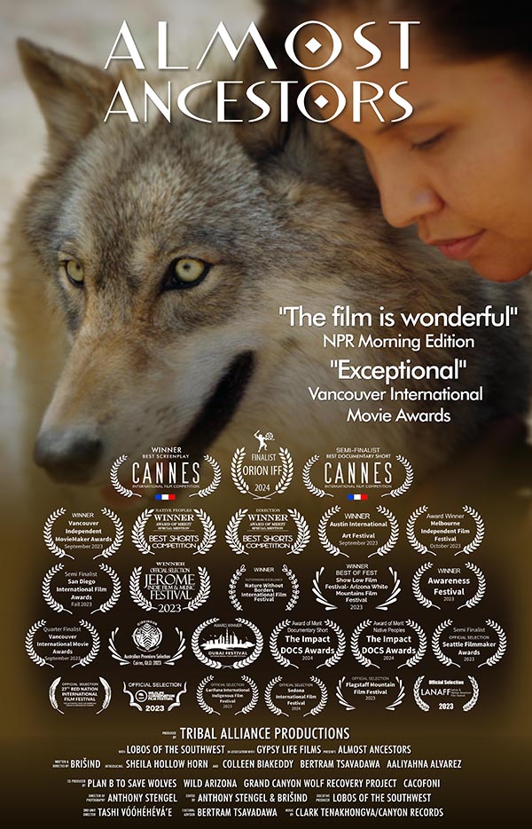 Lobos of the Southwest is thrilled to announce the creation of a short film, Almost Ancestors, to illustrate the parallel paths of displacement experienced by Mexican gray wolves (lobos) and indigenous peoples. Award-winning filmmaker BriĊĦind (The Doctrine of Recovery) created and directed the film. Several Hopi cultural advisors consulted on the film to ensure cultural accuracy. Experience the story of a young Hopi woman facing displacement in a changing landscape, threatening her connection to the land and her family. Her kinship with a lobo and her call toward community guide her on an incredible journey to a sacred place called home.